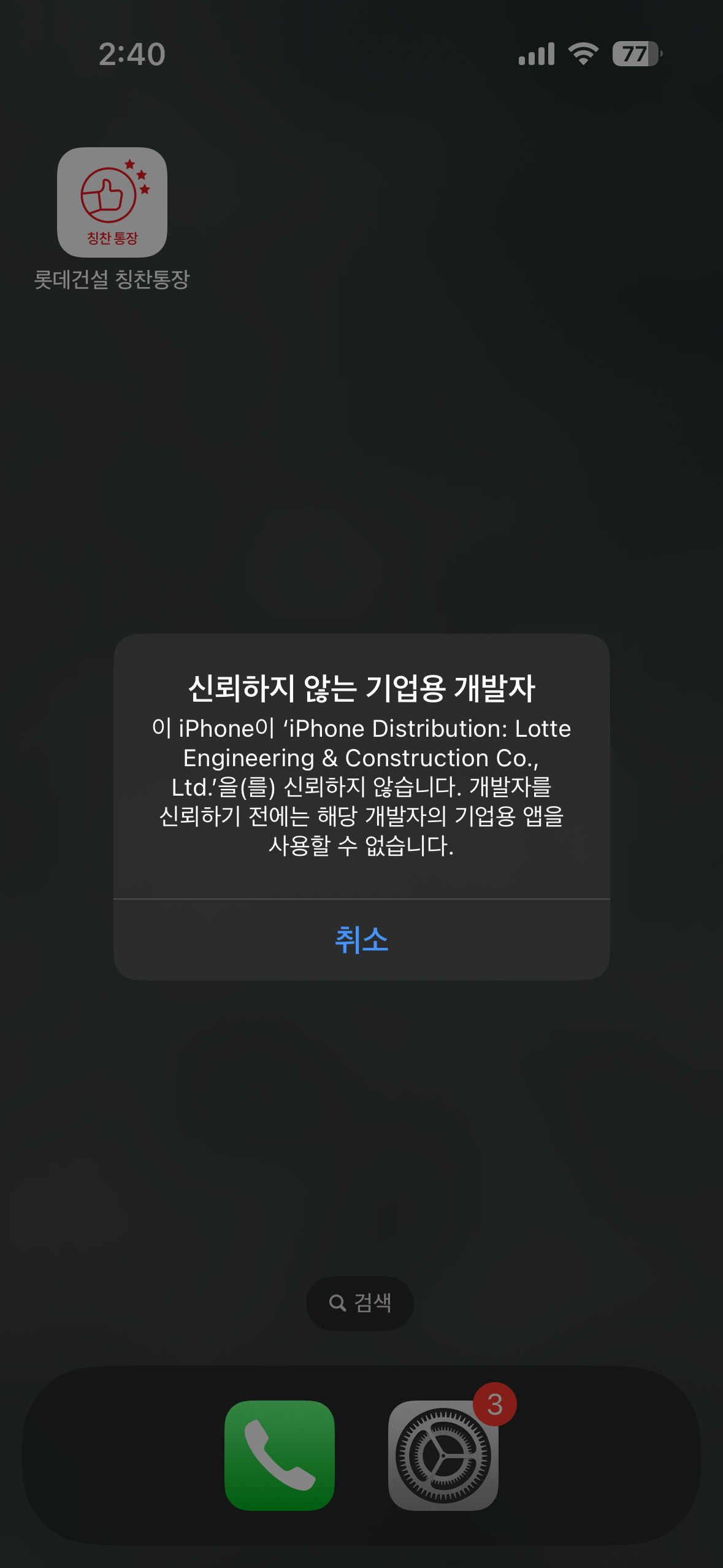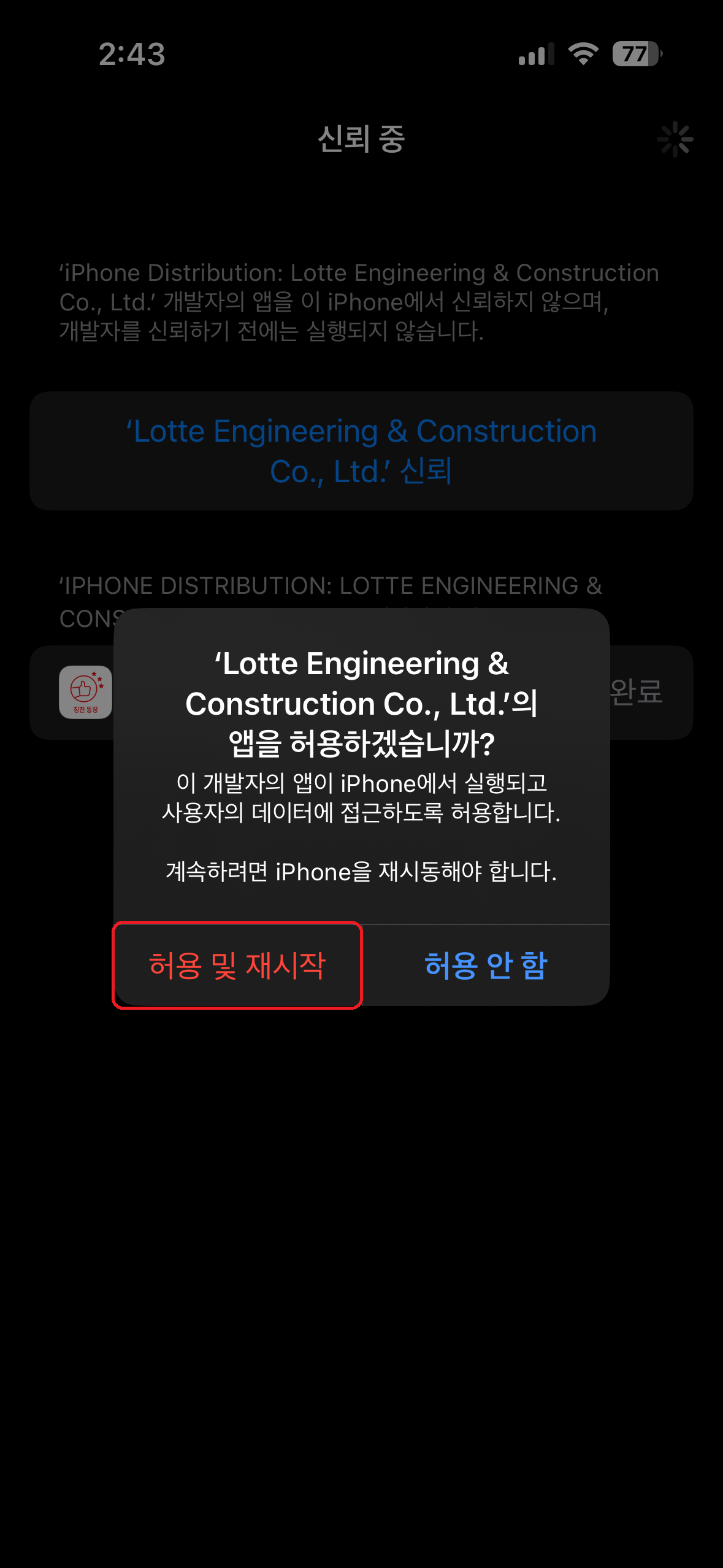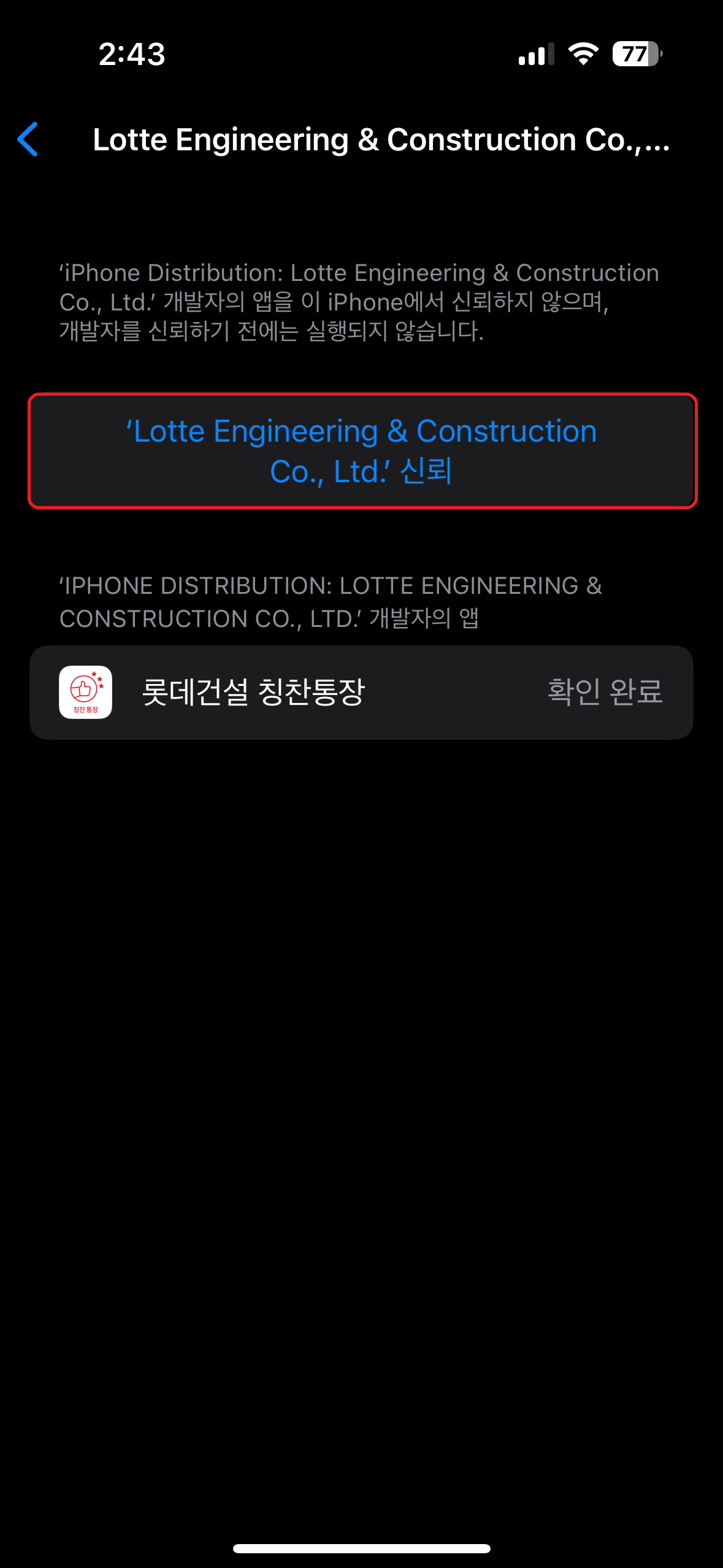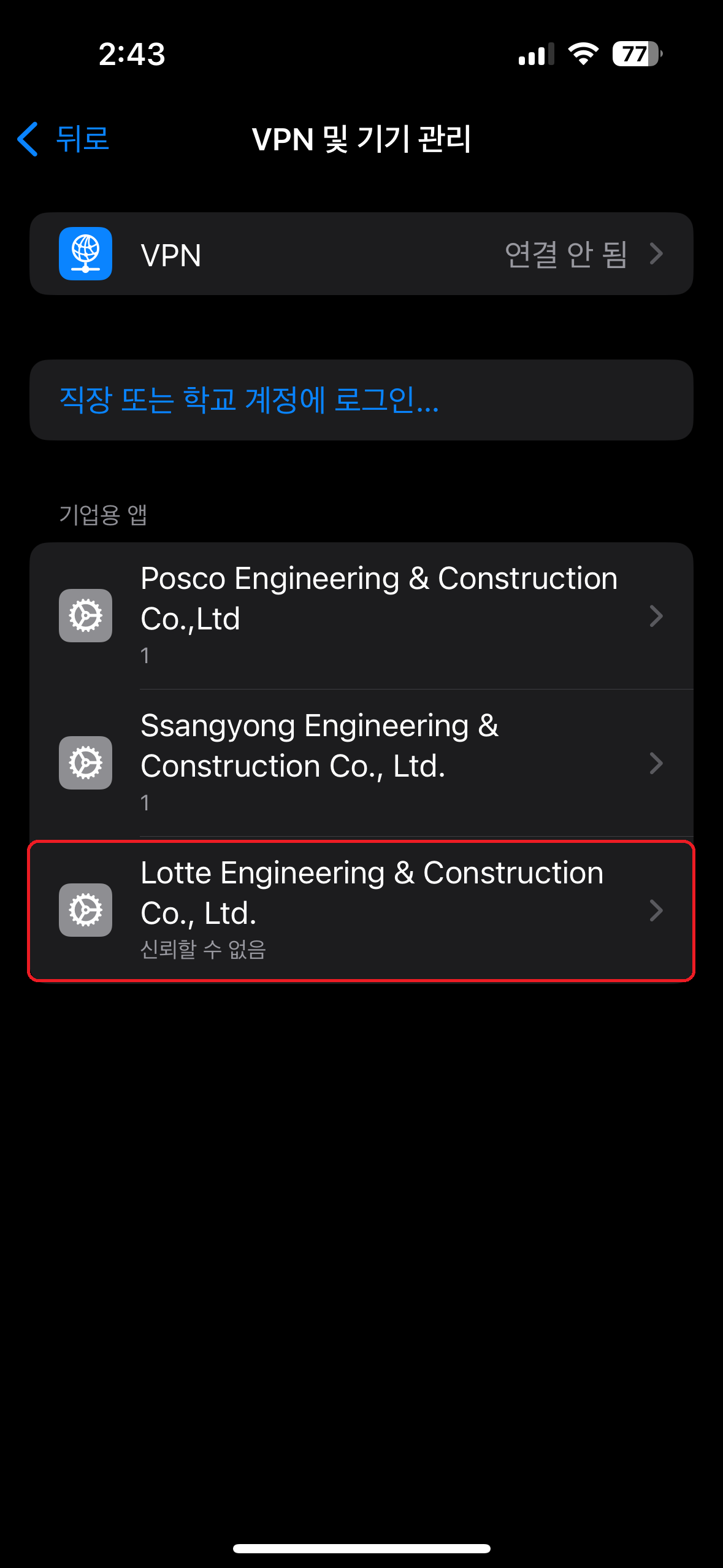 5. 기업용 앱 아래에 있는 "Lotte Engineering & Construction Co., Ltd." 클릭
